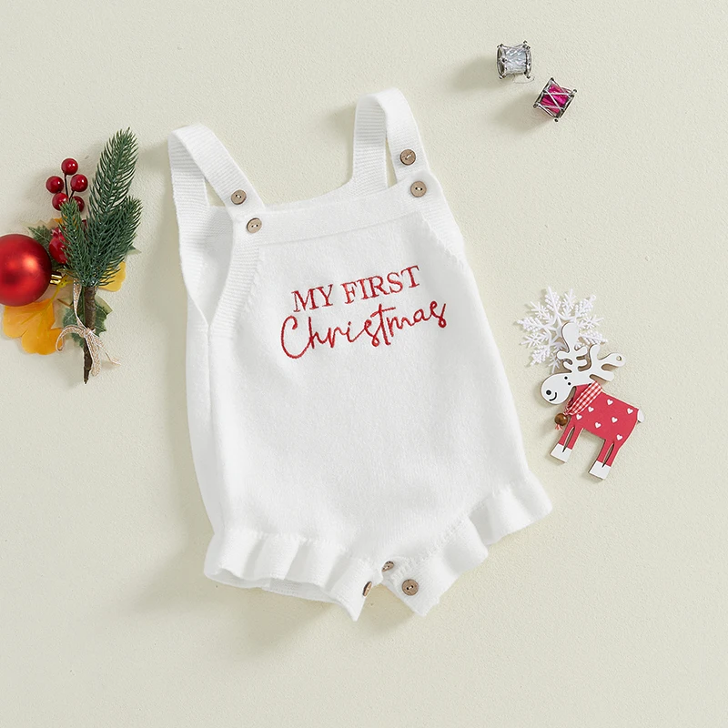 Celebrate your baby’s first Christmas in cozy style with this adorable knitted romper. Featuring delicate embroidery and festive button details, it’s perfect for holiday photos and family gatherings. The sleeveless design allows easy layering with a shirt or tights for extra warmth. Made from soft, breathable knit fabric, it’s gentle on newborn skin and ideal for all-day wear. Convenient buttons make dressing and diaper changes quick and easy. Suitable for both baby boys and girls, the unisex design adds versatility and charm. The classic red and white holiday colors make it a timeless Christmas outfit. Designed for newborns and infants, it fits comfortably without restricting movement. Whether for Christmas Eve, photoshoots, or gifting, this romper adds festive cheer. Create heartwarming holiday memories with this special “My First Christmas” outfit.