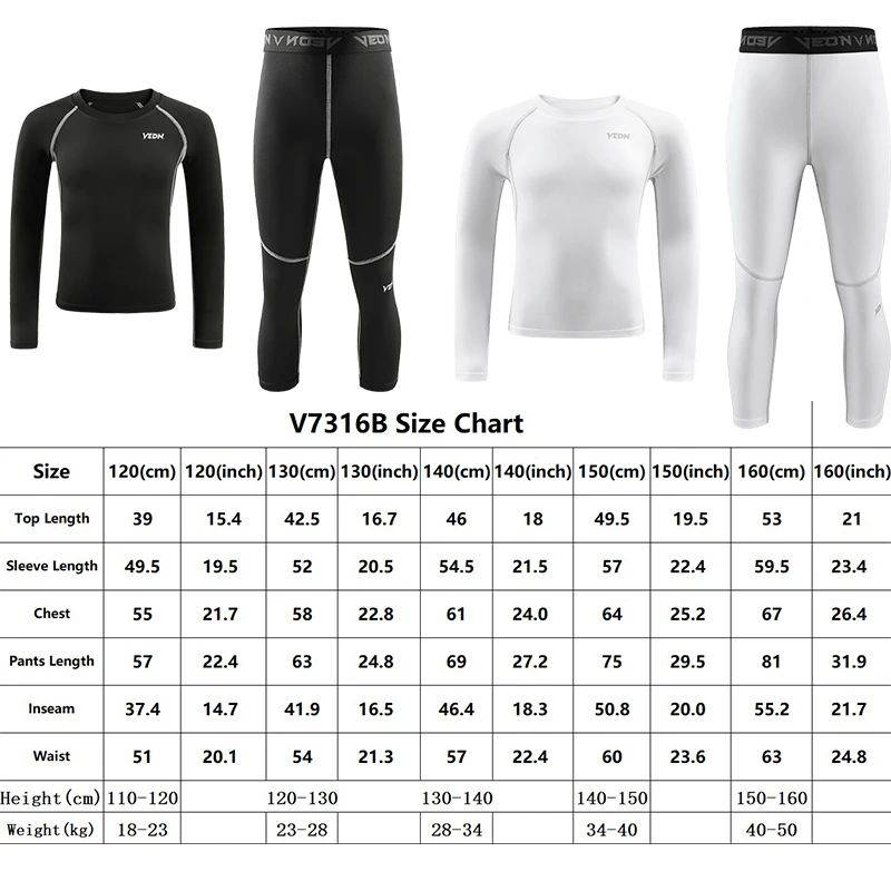 Item:One Set,include one piece long sleeve shirt,one piece long legging.Material:95% Polyester, 5% Spandex.Size:We have 5 sizes to choose,you can choose it according to our size chart.Color:Black;White.Feature:(1)Durable, lightweight, and quick-drying fabric wicks sweat away from the skin and provide your kids with cool and comfortable wear.(2)4-way stretch construction is good for squat and leg movement; The elastic waistband provides a comfortable fit.(3)The boys compression pants absorb muscle vibrations and prevent your kids' muscles and joints from getting injured, providing good support and shortening recovery time.(4)Perfect for basketball, football, baseball, icy hocky, running, cycling, hiking and other activities.
